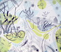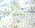 Colin sees the worked landscape leaving traces of habitation but generally not populated by figures, leaving the viewer to write his own text. His own footsteps in the painterly journey he is taking are evident in many of the works, reading sometimes like a map, and the evidence of human habitation is there in an old harrow, a bicycle or a worked out boat. There is a geometric abstraction informing his work, and a complete absence of sentimentality, resulting in a freshness and modern poetic quality. He spends much time walking and looking, and always works on location carrying his studio in a small bag. He finds that using watercolour gives him this freedom.